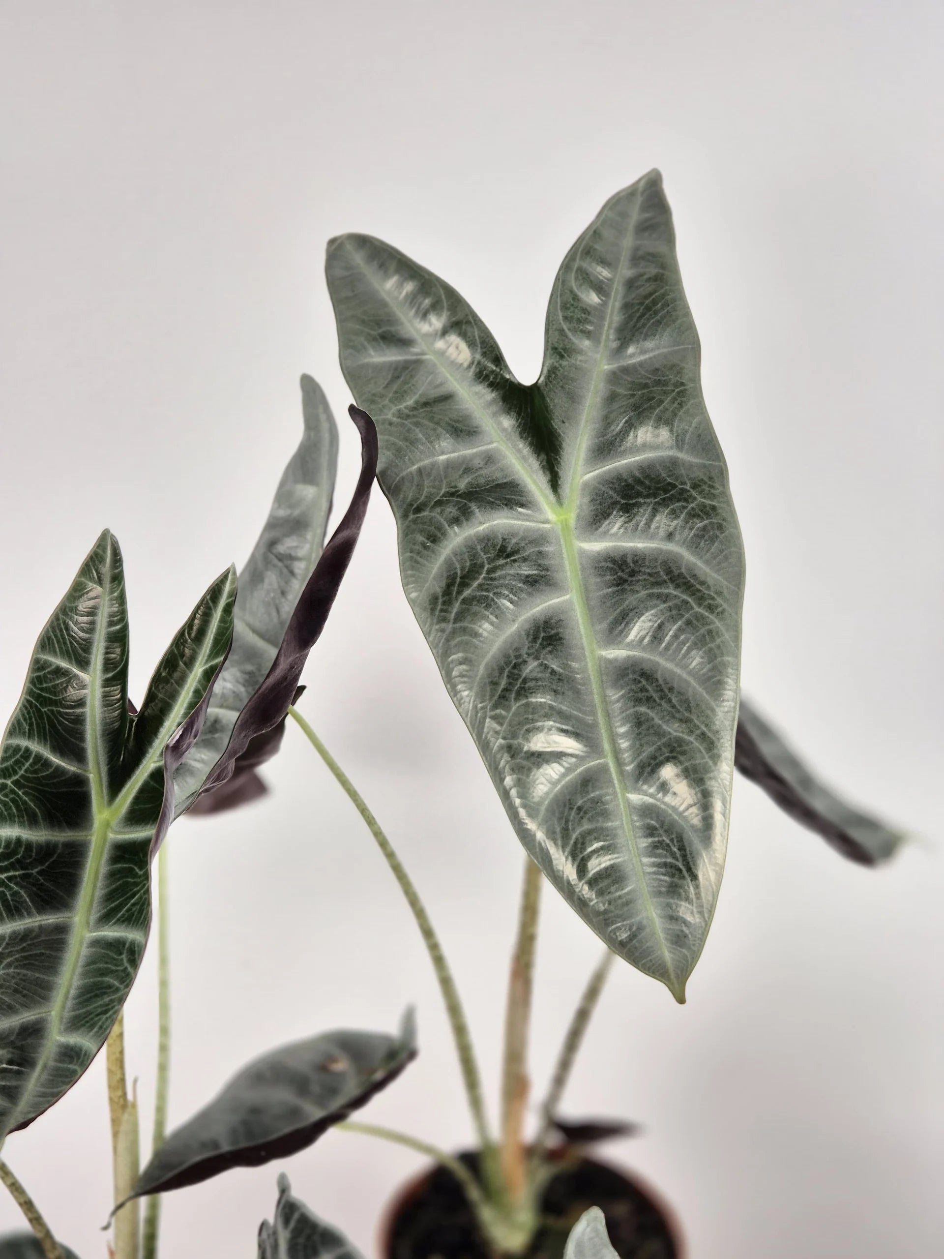Alocasia Longiloba 'silver' ist eine beeindruckende tropische Zimmerpflanze. Sie besticht mit ihren langen, pfeilförmigen Blättern und der auffällig silbrigen Färbung. Die Blätter sind dunkelgrün mit einem metallischen, silbernen Glanz und silbernen Blattadern. Ihre dunkelroten Blattunterseiten verleihen ihr ein elegantes Aussehen. Geliefert im 10 cm Topf.